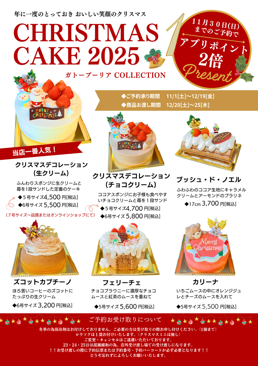 クリスマスケーキ1 クリスマスケーキ2 クリスマス期間及び前後日のケーキの販売について プリントデコレーション(オンラインショップ予約可) 生クリームデコレーション(オンラインショップ予約可) チョコクリームデコレーション(オンラインショップ予約可) スペシャル生クリーム デコレーション(オンラインショップ予約可) フルーツデコレーションケーキ(オンラインショップ予約可) チョコベリーケーキ(オンラインショップ予約可) おとぎの国の アリス(オンラインショップ予約可) シンデレラ(オンラインショップ予約可) ゆめいろユニコーン(オンラインショップ予約可) ローズひめ ドレスケーキ(オンラインショップ予約可) プリンセス ドレスケーキ(オンラインショップ予約可) ガナッシュケーキ 3日前予約 コキーヌ 3日前予約 ルージュ 3日前予約 バロン 3日前予約 ムーンフラワー(オンラインショップ予約可) グレース(オンラインショップ予約可) ロッソ (オンラインショップ予約可) アントルメロールケーキ(オンラインショップ予約可) 和栗のモンブラン生クリーム(オンラインショップ予約可) 昔ながらのモンブラン生クリーム(オンラインショップ予約可) いちごタルト 11月〜5月限定 和栗のモンブランタルト(オンラインショップ予約可) フルーツタルト(オンラインショップ予約可) スーパートレイン(オンラインショップ予約可) 黄色い車(オンラインショップ予約可) パンダくん(オンラインショップ予約可) くまくん(オンラインショップ予約可) うさぎちゃん(オンラインショップ予約可) チーズスフレ 3日前予約 クラシック ショコラ(オンラインショップ予約可) 2段ケーキ(オンラインショップ予約可) グレース2段(オンラインショップ予約可)